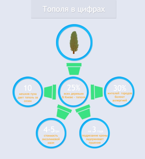 Как нам рассказал заместитель директора по научной работе Ботанического сада имени Фомина Роман Палагеча, один тополь за сезон цветения дает приблизительно 10 больших мешков пуха. Если учитывать, что четверть от общего количества деревьев в столице составляют именно тополя, становится понятным настолько большое количество пуха на улицах города. К тому же пух дают женские особи абсолютно всех видов тополей высаженных в Киеве.