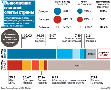 Пока в казну собрано почти 190 млрд грн, израсходовано 220 млрд (см. инфографику). По подсчетам экспертов «Сегодня», если условно разбить смету расходов и доходов на 12 месяцев, получим недовыполнение около 10% (19—20 млрд грн). При этом запланированный дефицит — 50,59 млрд грн, но на весь год.
