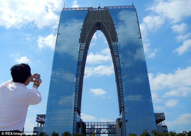 В китайском городе Сучжоу практически достроили новый необычный небоскреб Gate of the Orient ("Ворота Востока") высотой 300 метров. Он выполнен в форме гигантской арки, однако, в интернете пользователи уже сравнивают его с парой гигантских брюк.