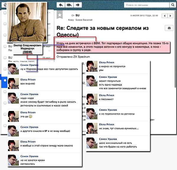 В одном письме были такие слова: «Игорь (Марков — А) на днях встречался с ВВМ (Виктором Медведчуком — А). Тот подтвердил общую концепцию. Не позднее 15 года все изменится, а этого п*ра (Президента Украины Виктора Януковича — А) загоним в его кенгуру в Межигорье, а пока — собираем группу в Раде».