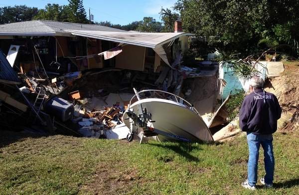 Воронка глубиной 15 метров в диаметре достигает почти 30 метров и продолжает расти. В нее уже провалились часть дома, бассейн и катер.