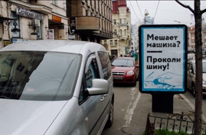 Противостояние водителей и пешеходов накаляется: на днях неизвестный киевлянин не пожалел денег и разместил на ситилайте призыв «Мешает машина? Проколи шину!» (см. фото). Как сообщили нам в одном из рекламных агентств, минимальная цена за такую рекламу — 400—500 грн за месяц, но добавили, что они бы подобный заказ не взяли. Юрист Владимир Столитний говорит, что размещать такую рекламу — небезопасно, так как она содержит призыв к незаконному деянию.