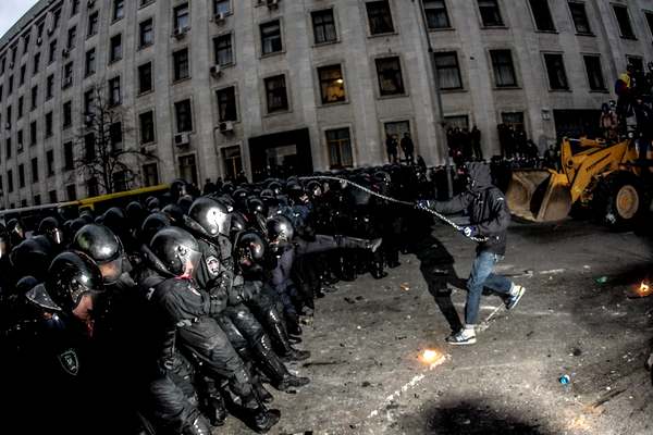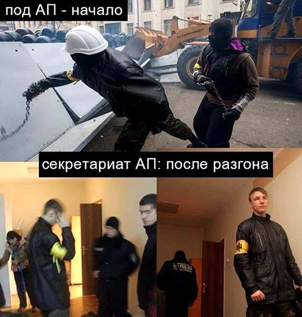 Итак, трактор с мифическими «националистами» занял «позицию» на Банковой и начал штурм шеренги срочников — по сути, таких же самых детей, как и избитые днем ранее на Майдане Независимости тем же «Беркутом». В это время милицейские же провокаторы избивали юных ВВ-шников цепями, калечили камнями, палками и файерами, создавая нужную постановщикам «шоу» «картинку».