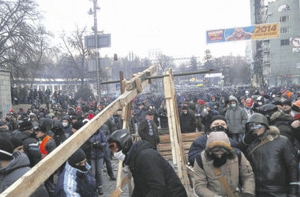 Да-да. На Грушевского строят катапульту. Для того, чтобы что-то метать. Что — непонятно, но во все времена снарядами катапульт было все, что а) тяжелое б) горит в) взрывается. Так что, чисто теоретически, зарядить ее можно как камнями, так и коктейлями Молотова. Причем несколькими сразу — штук по пять-десять. Лучшие образцы умудрялись посылать снаряды на 600 метров.