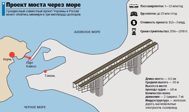 По словам вице-премьера правительства Крыма Рустама Темиргалиева, стоимость моста, в зависимости от проекта, может достигать от $1,5 до 3 млрд. За все 23 года независимости Украины у нас еще не строили ничего, сравнимого по масштабам с такой эпохальной стройкой. А вот у России есть совсем свежий опыт возведения подобных объектов — за последние годы наши соседи открыли целый ряд крупных мостовых переходов. Среди них — Золотой мост, Русский мост и Амурский мост (все — во Владивостоке), которые в сумме обошлись России минимум в $9 млрд.