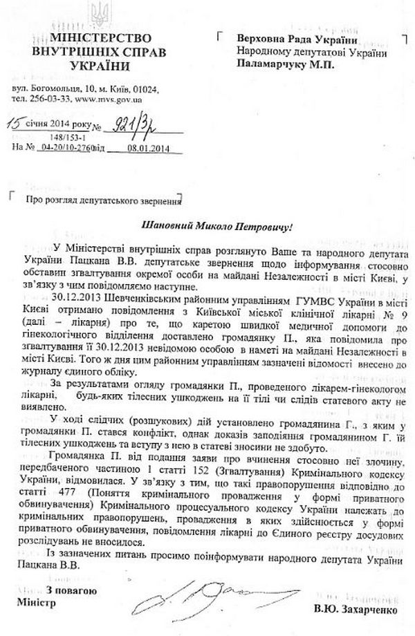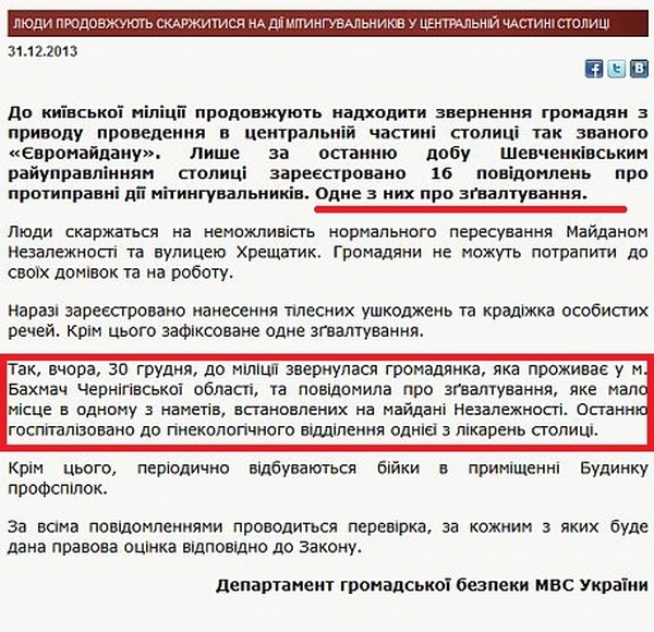 Министерство внутренних дел подтвердило, что распространенная им информация об изнасиловании 30 декабря 2013 года женщины в одной из палаток на Майдане Независимости - ложная. Тем не менеее, информация не опровергнута на сайте ведомства.