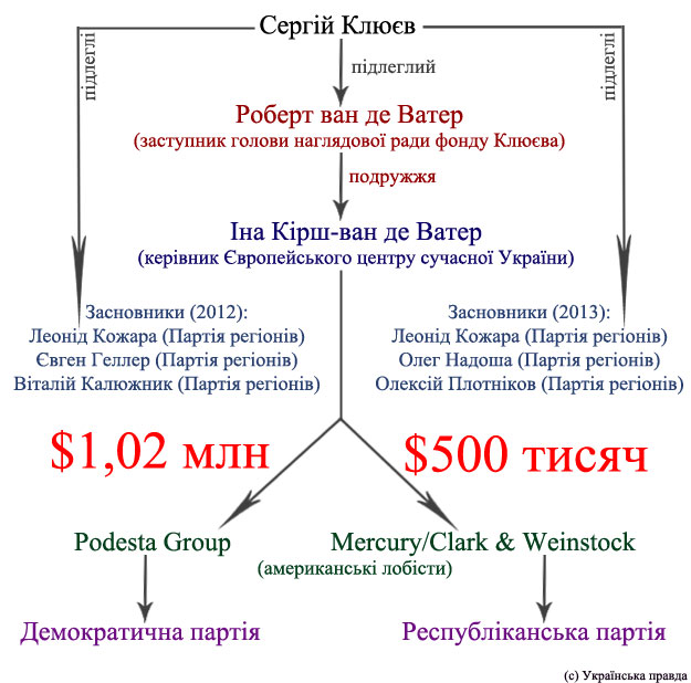 Брюссельський центр законтрактував дві лобістські компанії. Це – Podesta Group, заснована братами Тоні та Джоном Подестою, що співпрацювали з президентами-демократами Білом Клінтоном і Бараком Обамою. А також – Mercury/Clark & Weinstock, за якою стоїть колишній конгресмен-республіканець Він Вебер, що був залучений в останню виборчу кампанію кандидата-республіканця Мітта Ромні. Керівник фірми Mercury/Clark & Weinstock Ед Катлер (Ed Kutler) супроводжував Сергія Клюєва під час його відвідин Вашингтона торік.