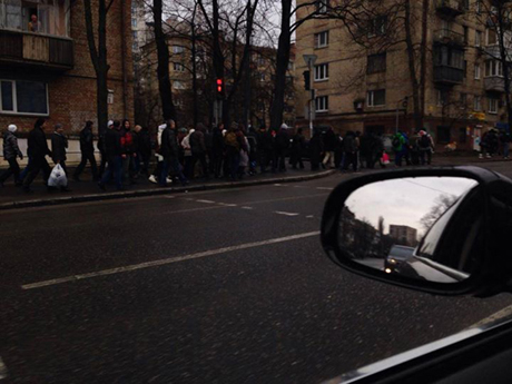 Кроме того сообщается о большом количестве "титушек" в более отдаленных районах Киева: на Железнодорожном шоссе и ул. Киквидзе (метро Выдубичи): в направлении центра движется колонна из 2-3 тысяч человек. Кроме того на Подоле (ул. Константиновская) была замечена группа из 500-700 человек.