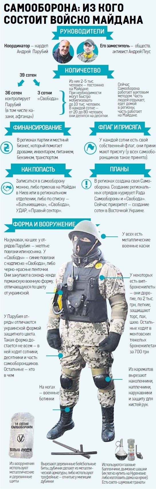 Нынче Киев не узнать. Теперь улицы патрулируют представители Майдана — мужчины в касках, камуфляже и с дубинками в руках. Они взяли под охрану все важные объекты в столице: Верховную Раду, Кабмин, Администрацию президента, Нацбанк и СБУ, а также провожают одиноких прохожих до дома.