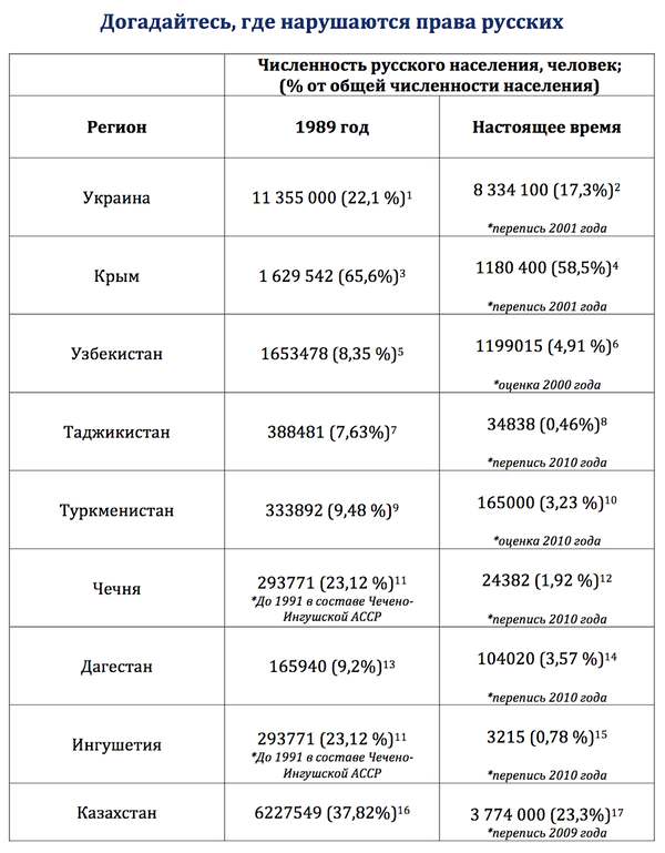 Посмотрите на эту таблицу: в ней данные о количестве русских по переписи 89 года и на дату последнего правдоподобного исследования.