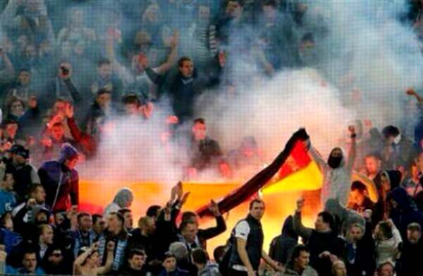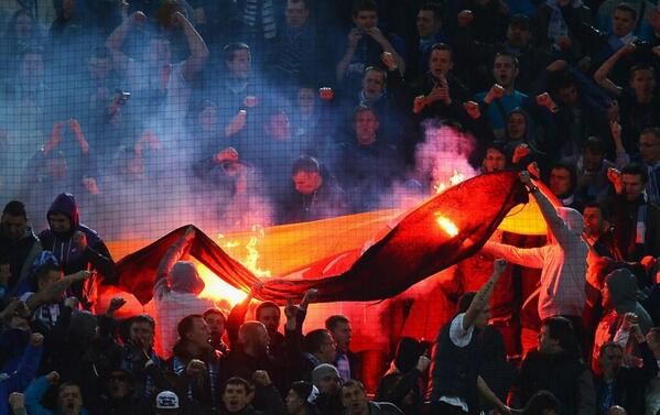 Болельщики «Зенита» сожгли флаг Германии и кричали «Севастополь — русский город!» во время ответного матча против "Боруссии" в Лиге чемпионов в Дортмунде.