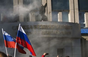 Как сообщалось, вчера, 6 апреля во время проведения акции возле здания СБУ в Луганской области произошел захват здания СБУ - митингующие разбили окна, повредили входную дверь, задымили здание. После чего неустановленные лица извне поднялись на здание СБУ на уровень 2-го этажа, где расположили флаг Российской Федерации.
