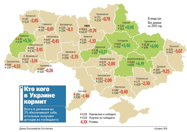 Реформа по децентрализации власти, которую собирается внедрить власть, предусматривает, что в регионах будет оставаться больше заработанных ими денег, и этими средствами они смогут распоряжаться самостоятельно. Сейчас основная часть денег, которые получили регионы, перечисляются в Киев и уже из центра перераспределяются. Но в Украине за прошлый год только 6 регионов отдали в государственный бюджет больше средств, чем получили из столицы (см. инфографику). А вот остальные области могут и не обрадоваться самостоятельности, которую им предложит власть — ведь им тогда придется не ждать денег из Киева, а активно зарабатывать их самостоятельно, и возможно, даже вводить местные налоги.