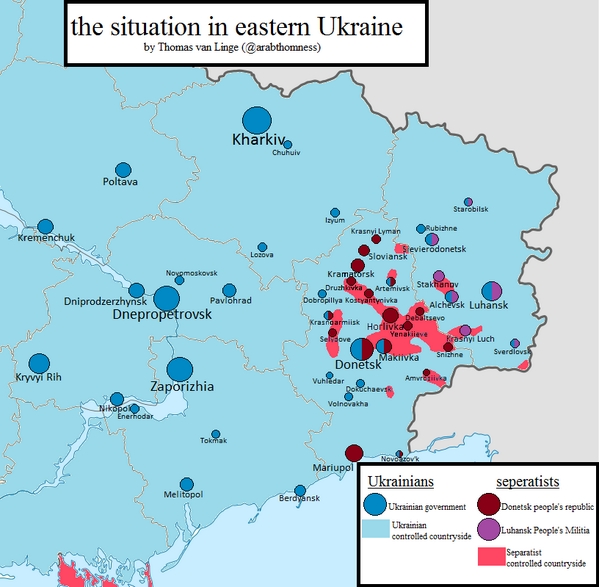 Где сепаратисты проводили свой так называемый "референдум". Синее и голубое - правительственные силы и свободная от террористов украинская территория. Красные и фиолетовые пятна - территория, на которой боевики пытались провести свой "референдум" (карта - twitter.com/arabthomness)