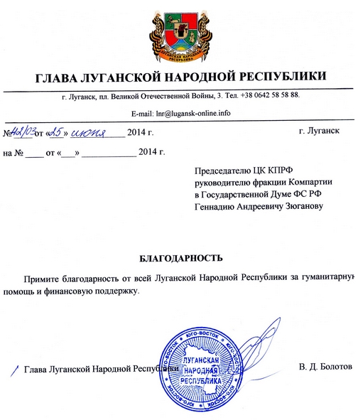 Террористы из самопровозглашенной Луганской народной республики поблагодарили лидера российской коммунистической партии Геннадия Зюганова за "гуманитарную помощь и финансовую поддержку". Об этом говорится в документе, фото которого выложили на сайте ЛНР.