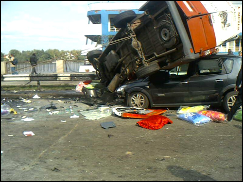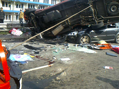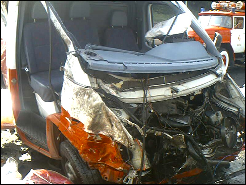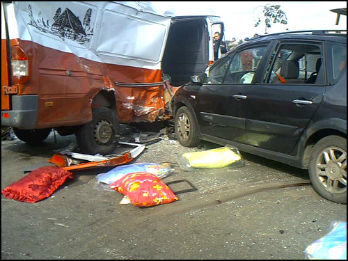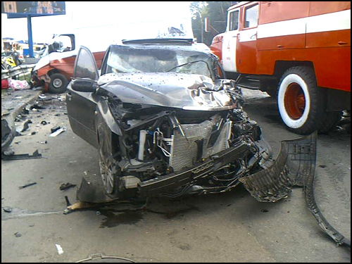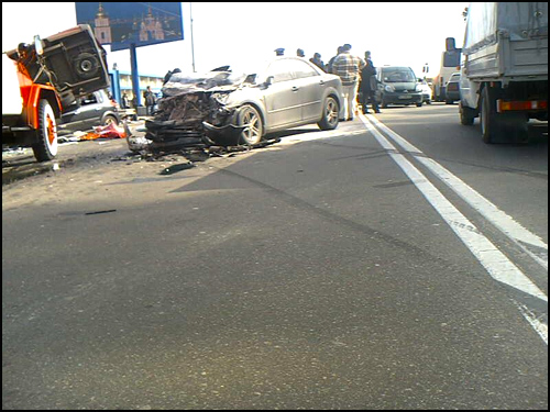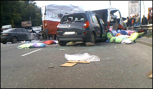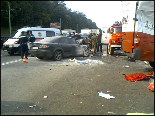 В четверг, 25 сентября, на Набережном шоссе в Киеве произошла жутчайшее дорожно-транспортное происшествие, какого украинская столица еще не видела: Mercedes Sprinter, скрываясь с места ДТП, вылетел на встречную полосу, где в лобовую столкнулся с Hyundai Sonata, Renault Scenic и Mazda6.