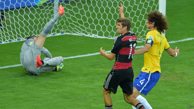 Томас Мюллер забивает первый гол в ворота бразильцев
