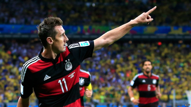 Немецкий нападающий Мирослав Клозе стал лучшим бомбардиром в истории чемпионатов мира: в полуфинале против команды Бразилии он забил свой 16-й по счету мяч.