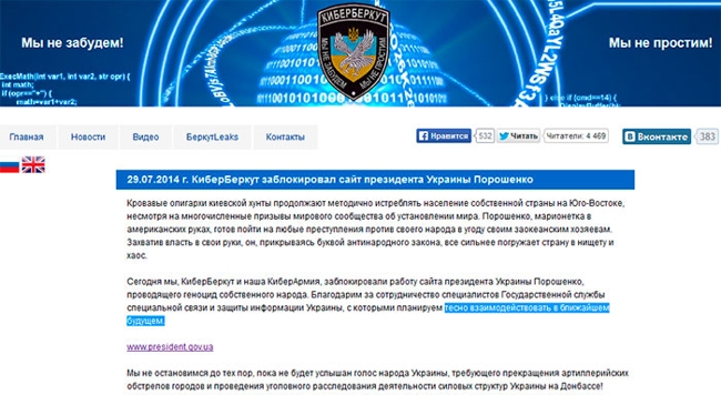«Порошенко, марионетка в американских руках, готов пойти на любые преступления против своего народа в угоду своим заокеанским хозяевам, — сказано в заявлении. — Сегодня мы, КиберБеркут и наша КиберАрмия, заблокировали работу сайта президента Украины Порошенко, проводящего геноцид собственного народа».