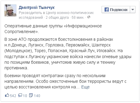 Руководитель ИС Дмитрий Тымчук сообщает, что боевики проводят контратаки сразу по нескольким направлениям.