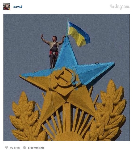Сегодня утром на шпиле сталинской высотки на Котельнической набережной в Москве вывесили флаг Украины.