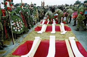 Дальше - несколько сюжетов собственно о похоронах. «Россия прощается с погибшими в Донбассе героями-добровольцами», - говорится в заголовке НТВ. В сюжете же сказано, что «каждый день в зоне карательной операции, пытаясь защитить мирных граждан Донбасса, гибнут добровольцы из России. По словам родственников и коллег, они осознанно шли на риск, отправляясь на восток Украины, потому что больше не могли со стороны наблюдать за тем, как украинские боевики убивают женщин, стариков и детей. Их помощь народу Новороссии, по признанию ополченцев, неоценима. И на родине они тоже навсегда останутся героями».