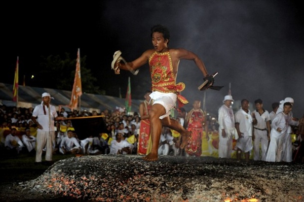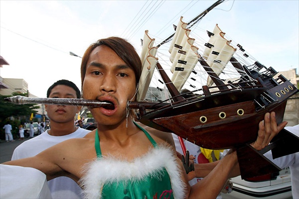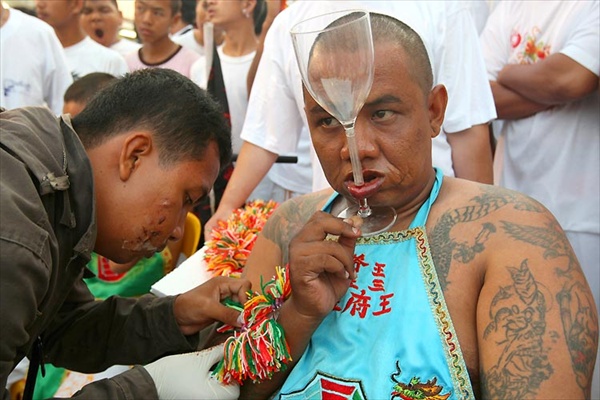 Как мы уже говорили, на этом празднике действует практика самоистязания. Участники прокалывают себе щеки ножами, железными палками, саблями, копьями, прутьями в несколько метров длиной и другими экзотическими предметами. Это происходит днем, а вечером эти же участники бегают босиком по раскаленным углям. Также практикуется самобичевание с помощью взрывов фейерверков.