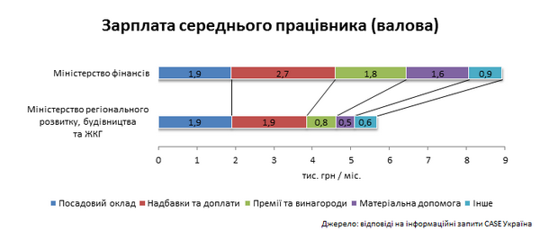 Например, валовая месячная зарплата среднего работника Министерства финансов в первом полугодии 2014 года составляла 8900 грн (чистая - примерно 7300 грн) в то время, как среднего работника Министерство регионального развития, строительства и ЖКХ - 5700 грн (чистая - примерно 4700 грн).