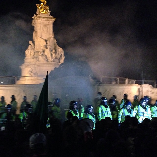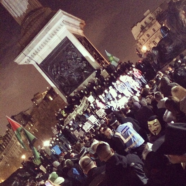 Эпицентром лондонского митинга вечером 5 ноября стала Парламентская площадь в центре британской столицы. Позже участники переместились к Букингемскому дворцу и зданию, в котором размещается центральная студия компании «Би-Би-Си». Полиция дважды применяла дубинки во время попытки прорыва оцепления, однако существенных травм никто не получил. По меньшей мере пять человек были задержаны.