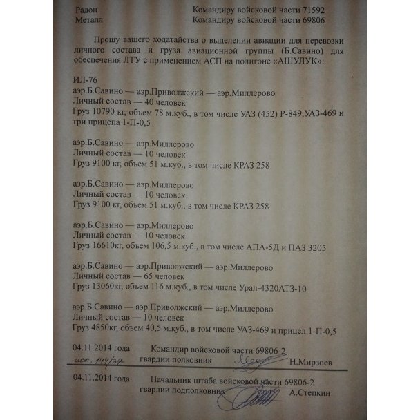Как свидетельствует служебная записка командира в/ч 69806-2 от 4 ноября 2014 года, а также таблица боеготовности экипажей, которые будут задействованы в перевозке грузов, личный состав и грузы авиагруппы с авиабазы "Сокол" (Пермь, Большое Савино) перебрасывают на аэродром Миллерово.