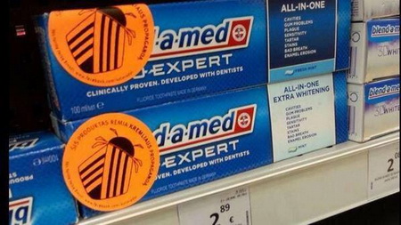 Акция называется "Не покупай кремлевскую пропаганду". Товары производителей, которые не отказались размещать свою рекламу на российских каналах, теперь "украшают" наклейки с изображением колорадского жука.