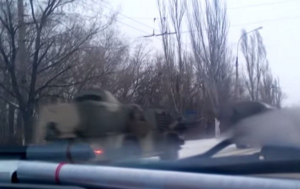 В колонне можно разглядеть современные российские БПМ-97 "Выстрел", тентованные грузовики, в которых находились военные, танки.
