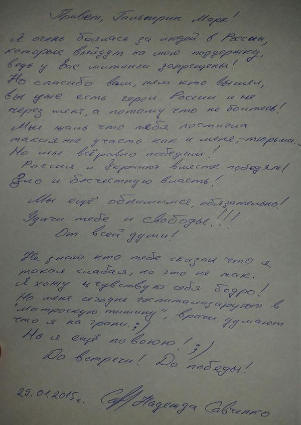 Савченко перед своим этапированием написала письмо российскому оппозиционеру Марку Гальперику, в котором рассказала, что "хочет и чувствует себя бодро".
