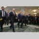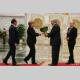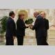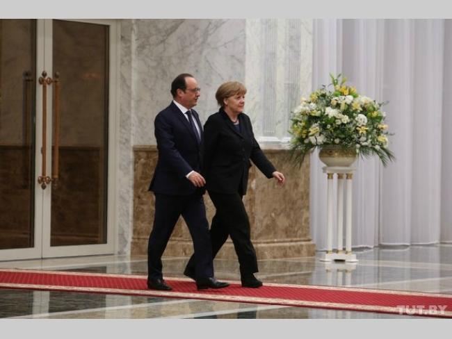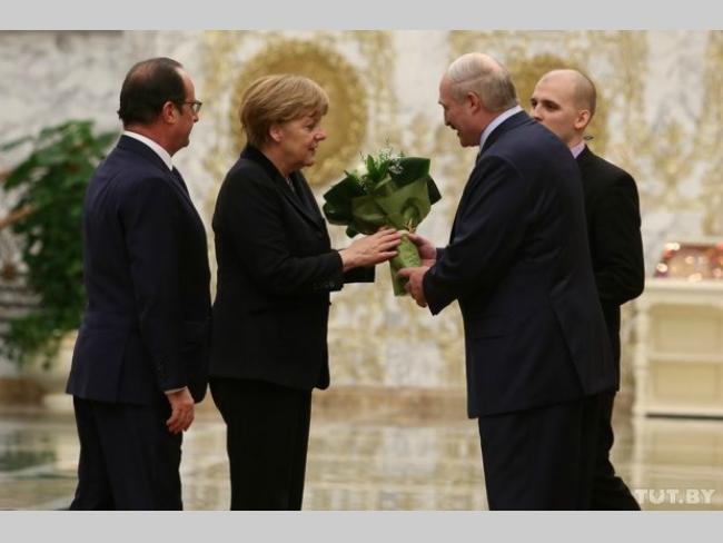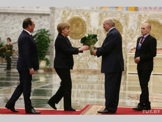 19.24 Вошли Олланд и Меркель. Александр Лукашенко вручил букет цветов Ангеле Меркель, около минуты переговорил о чем-то с ней и Олландом, а после они прошли в том же направлении, что и с Порошенко.