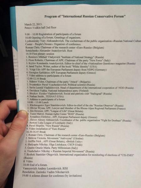 В мероприятии приняли участие представители одиннадцати партий и движений из ЕС, считающихся в своих странах наиболее одиозными националистическими структурами - финская "Национальная независимость", Партия шведов, греческая "Золотая заря", болгарская "Атака", британская "Национальная партия", итальянская "Новая сила", немецкая НДПГ (в настоящее время в Германии идут дискуссии о ее запрете). Также приехали различные "исследователи национального вопроса" вроде американского писателя Джареда Тейлора, автора расистской книги "Белая идентичность" или Криса Романа, председателя исследовательского центра "Евро-Русь" из Брюсселя.