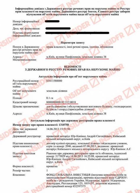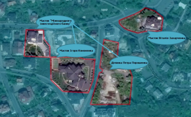Участки на Панфиловцев, 38 и 40 достались «Фонду глобальная инвестиция» по договорам купли-продажи (цены в извлечении не указаны) от Андрея Викторовича Дашкевича. В 2005-2007 годах он был председателем Госкомитета по вопросам регуляторной политики и предпринимательства. Кроме того, длительное время числился вице-президентом Украинского союза промышленников и предпринимателей.