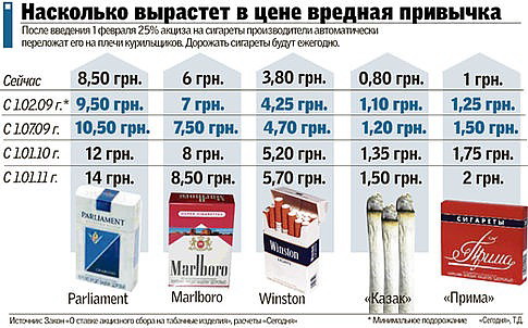 С 1 февраля в Украине подорожают сигареты, сигары и другие табачные изделия. Причина — вступают в силу новые акцизные ставки. Сначала налог поднимут на 25% (с нынешних 30 грн. за 1000 шт. сигарет с фильтром и 12,50 — без фильтра), затем с 1 июля с.г., с 1 января 2010-го и с 1 января 2011-го еще каждый раз на столько же от 30 грн. В итоге за два года цена в рознице подскочит почти вдвое.