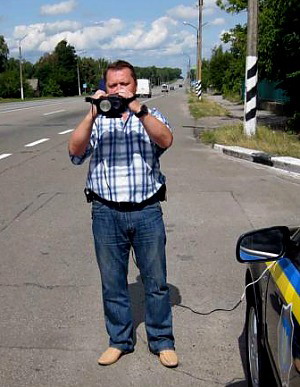 Для несения службы мы остановились неподалеку от перекрестка в селе Гарбузин. Как правило, большинство ДТП совершается в населенных пунктах. Справа и слева от нас в 40 метрах – пешеходные переходы. Здесь разрешенная скорость движения – 60 км/ч + 20 км/ч (допуск) = 80 км/ч максимум. Игорь Драный подключил «Визир», а Александру Пинчуку досталась участь общаться с нарушителями ПДД. Я думал, что нарушителей не будет – все водители «моргали» встречным автомобилям. Но первого нарушителя пришлось ждать недолго ровно 5 минут! Со скоростью 95 км/ч на нас несся автомобиль Volvo с немецкими номерами. Остановили. За рулем молодой немец, рядом с ним шикарная блондинка-переводчица. Объясняют, что впервые в Украине, и не знают наших Правил, обещают больше не нарушать. Их отпускают, и улыбающаяся блондинка машет нам ручкой…