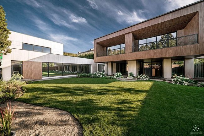 Это двухэтажный дуплекс, на две семьи, в современном стиле общей площадью 1000м2, гараж на 6 авто, хозяйственный блок, спортзал, приусадебный сад. Первый этаж в планировочном решении несет объединительную функцию. Он позволяет всей семье собраться в гостиной, зале или столовой. На втором этаже расположены приватные покои: две детские комнаты, хозяйская спальня с отдельными санузлами и гардеробом, а также выход на террасу.