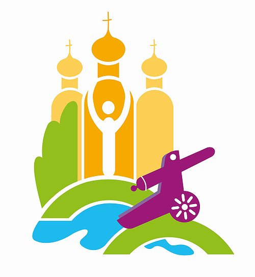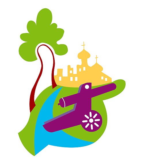 «Логотип основан на изображении колеса пушек, являющихся визитными карточками города. В то же время символизирует пересечение дорог, которые образуют крест». (Примечание организаторов: это как раз тот случай, когда идеи, что называется, «витают в воздухе»; почему – см. выше).