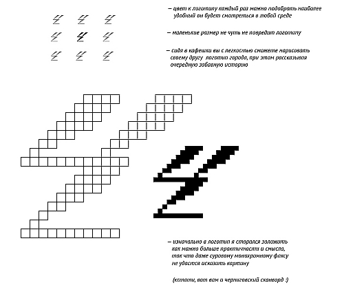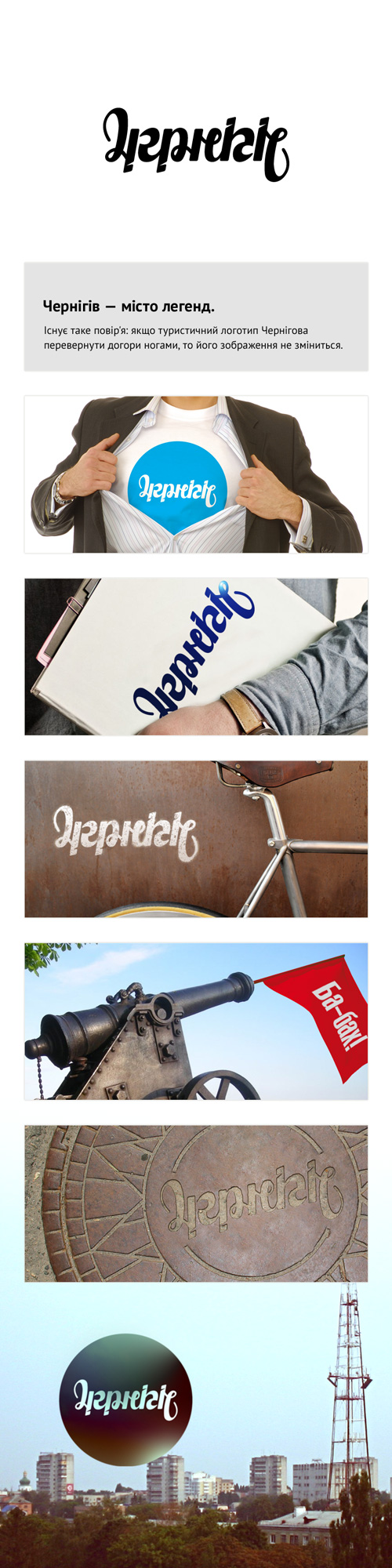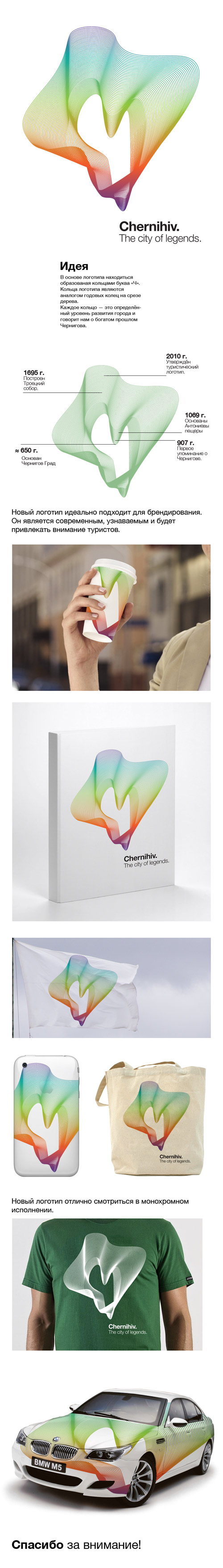 Подробное описание работы от самого дизайнера: «Практика показывает, что многие города мира имеют в качестве своего логотипа заглавную букву, с которой начинается название города. Известно также, что в молодёжной среде его часто называют сокращённо - "Че". Эти обстоятельства подвигли меня взять данную букву за основу Черниговского логотипа. Заглавная буква «Ч» скомпонована из наиболее известных визуальных символов нашего города.»