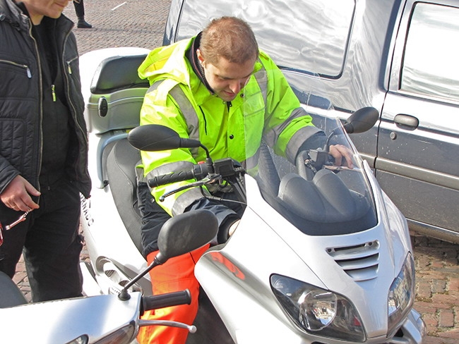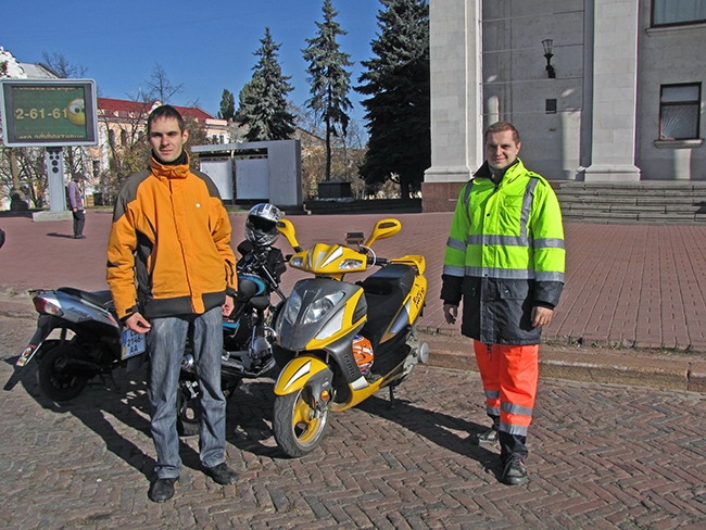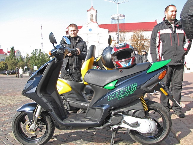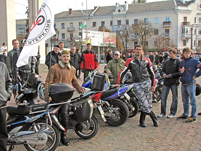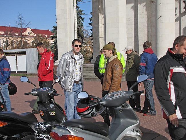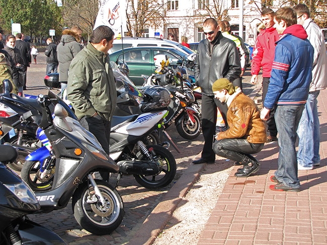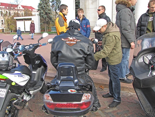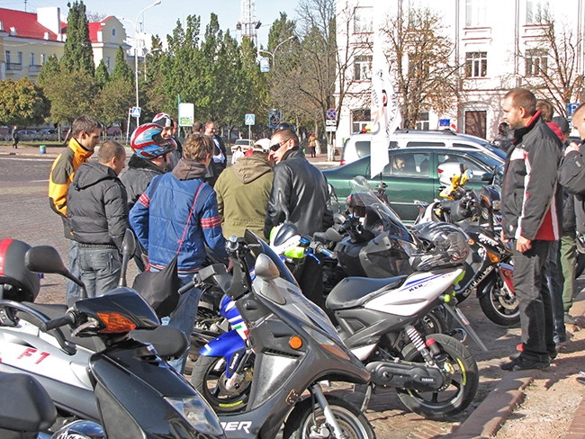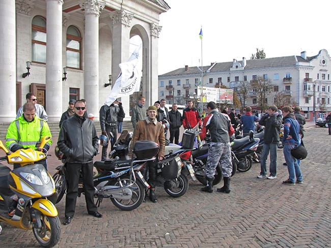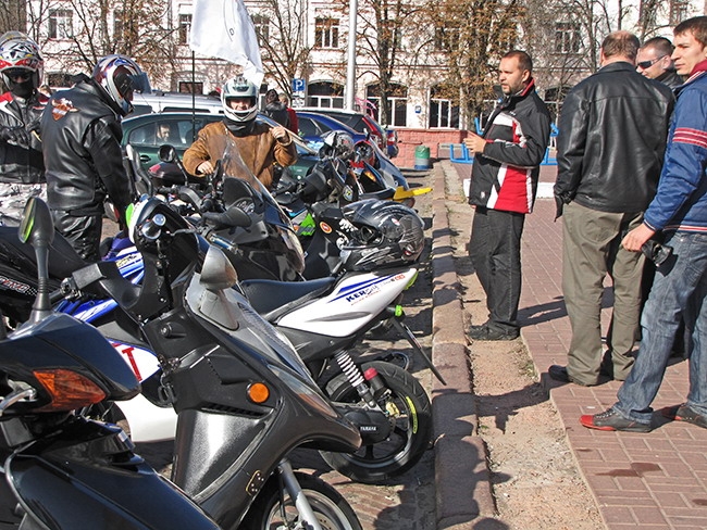 Первыми на место сбора прибыли Александр и Владимир, они и рассказали о проблемах скутеристов в этом сезоне. - По всем городам Украины идет сейчас кампания против скутеров. Из нас делают врагов общества, пиарятся на этом. А по большому счету все инициативы по регистрации скутеров – это сдаивание денег, – заявил Александр.