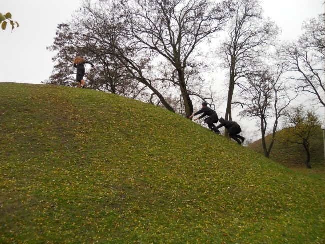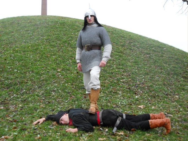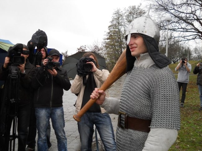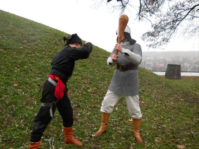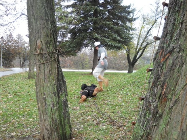Особенно впечатлил трюк, поставленный руководителем кружка экстремального туризма Анатолием Антишко. Подбитый стрелой Ильи-муромца, Соловей- разбойник заставил вздрогнуть всю группу журналистов, профессионально «свалившись» с верхушки дерева по почти невидимым тросам.