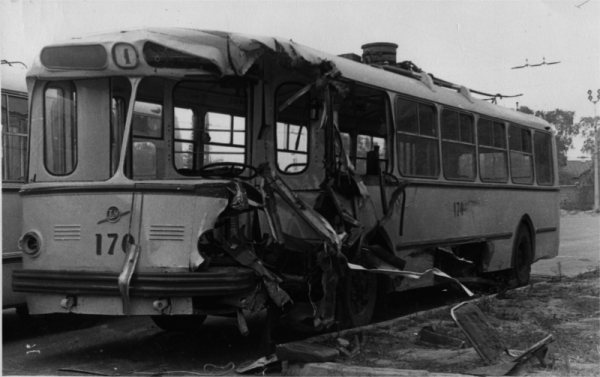Троллейбусный парк, маршрут №1 ЗиУ-5Д после аварии. Из архива Черниговского троллейбусного управления