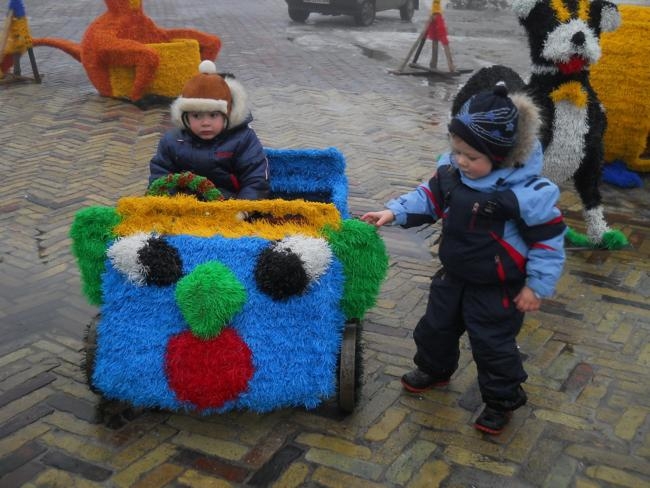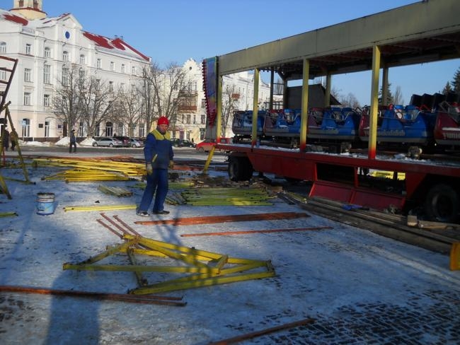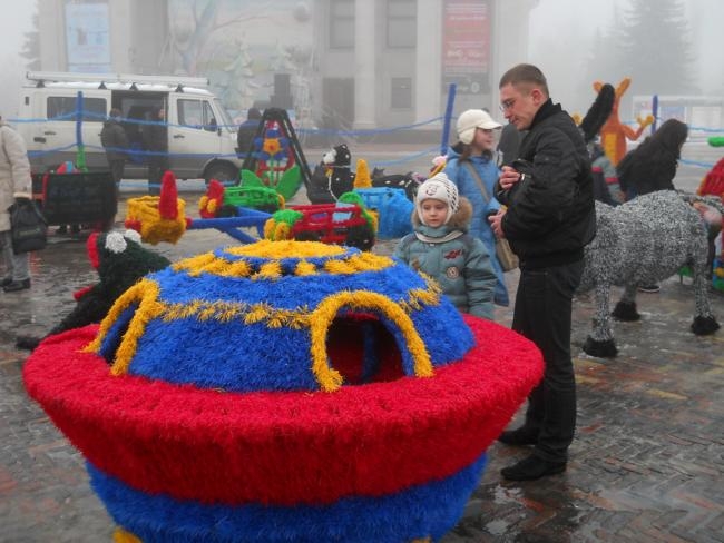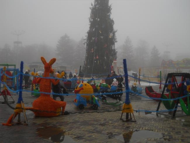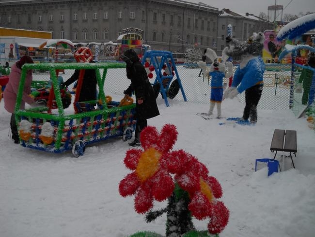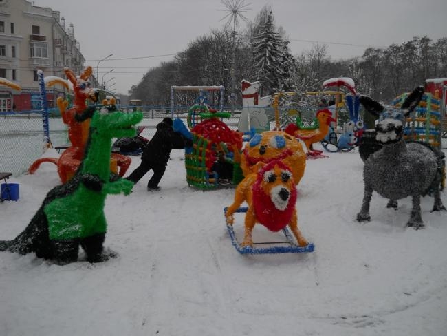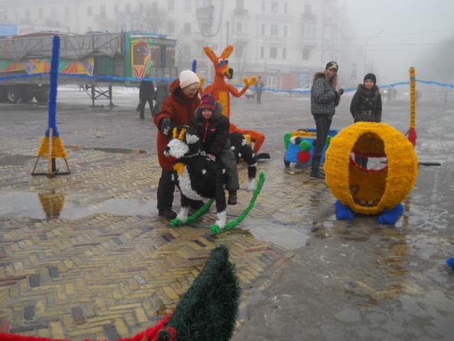 Обратил внимание на необычные, красочные фигуры, которые двое молодых людей устанавливали недалеко от елки. Как оказалось – это детский городок «Сказка», работавший летом в районе Мегацентра.