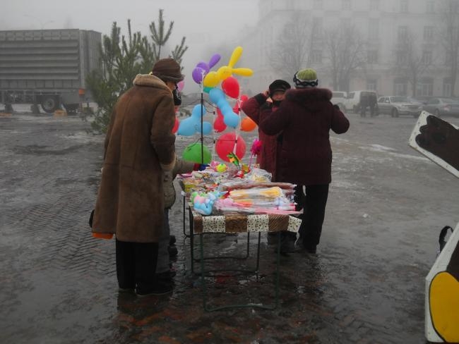 Как всегда, возле елочки готовы к «труду и обороне» киоски с горячими напитками и хот-догами. Здесь же, лоточники с разнообразными детскими игрушками.