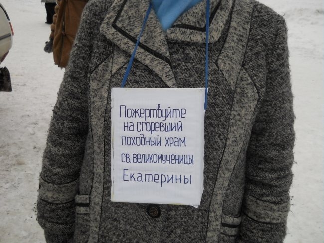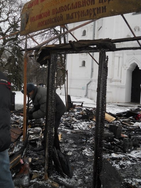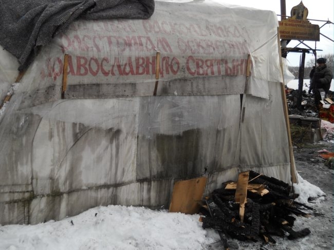По словам иерея Александра Ледового, противостояние за Веру длится с 2006 года. В новогоднюю ночь в храме шел молебен. Ровно в полночь, шесть человек, которые молились, услышали взрыв. Выскочили наружу и увидели, что задняя стена палатки горит. Кругом следы горючей жидкости и лежащие рядом канистры. Своими силами загасить огонь не удалось и все сгорело за считанные минуты. Прибывшим пожарным и сотрудникам милиции, осталось только зафиксировать факт.