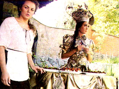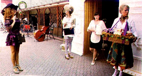 Еще во дворе были живые фуршетные столы. Посередине каждого, в отверстии, стояла девушка в костюме королевы, которая и предлагала желающим закуски — канапе с сыром, овощами, мясом.