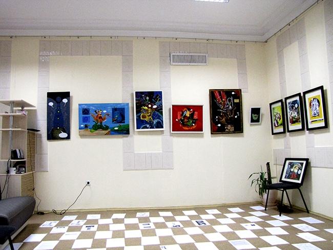 На выставке представлены работы, отражающие основные направления ГОП-АРТа: станковая живопись, графика, тупо-плакаты, рисунки о жизни первого супергероя украинских комиксов, козака-характерника Грицька Сраки.