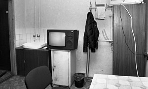Комната приема пищи, как и комнаты отдыха, поражают убогостью своей обстановки. Такое впечатление, что все, что здесь стоит, было найдено где-то на свалке. На полу в коридоре стоят карты города, схемы, графики. Они нужны бригадам для работы. Но повесить их некуда. Кстати, медики утверждают, что в помещениях на Любечской специально была сделана мебель. Но в комнаты на Одинцова она просто не поместилась…